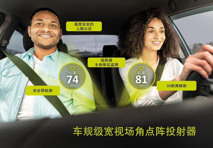 创迈思车规级宽视场角点阵投射器以单一模块具备对前排乘员的人脸认证、生命体征监测、优化安全气囊系统部署、安全带佩戴检测等多重功能。